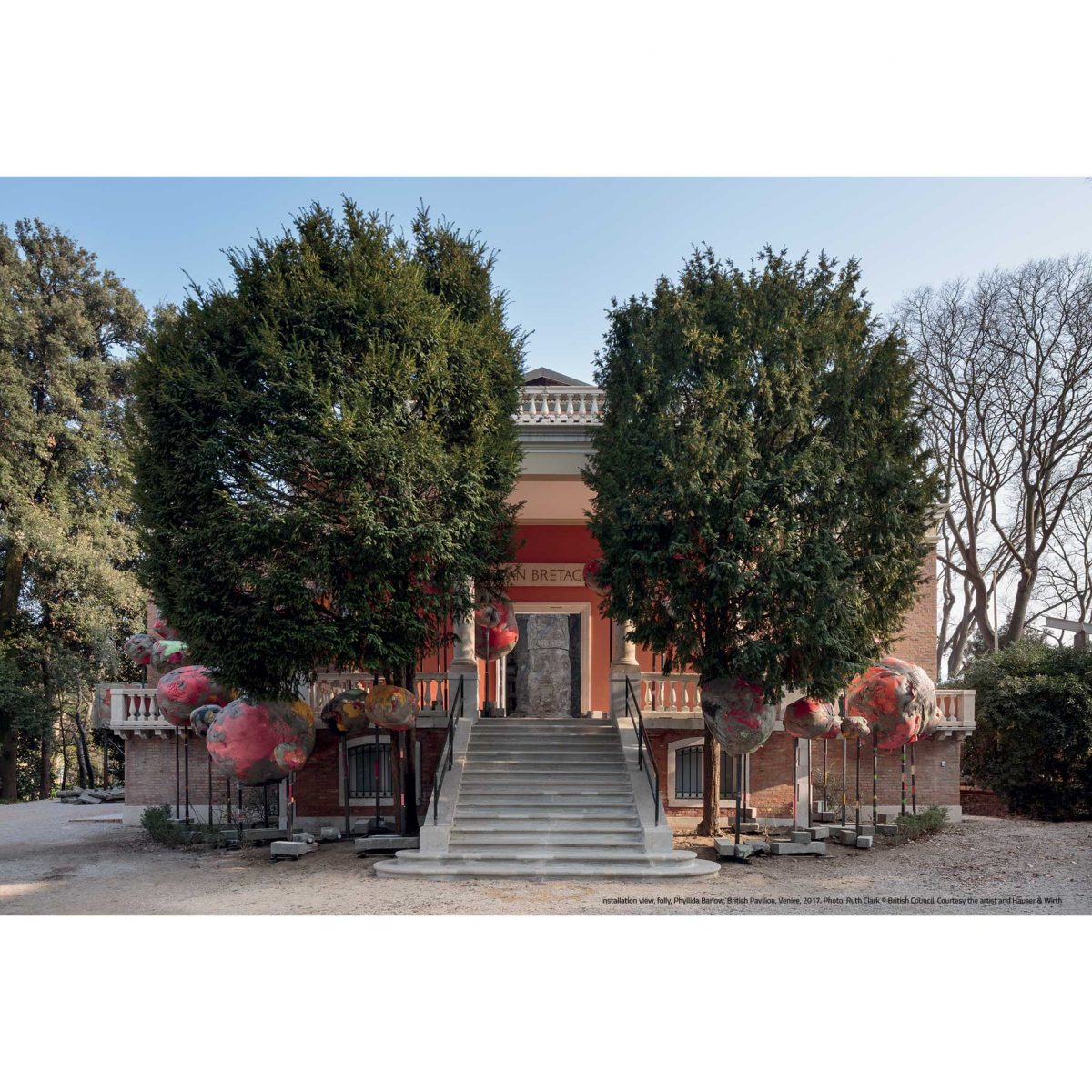 The first impression of the Pavilion entrance, populated with brightly coloured baubles jostling around the neoclassical portico and steps, appears joyful and celebratory. But these monstrous bulging forms also have a sinister quality as they press towards the viewer, taking over and dominating the space.