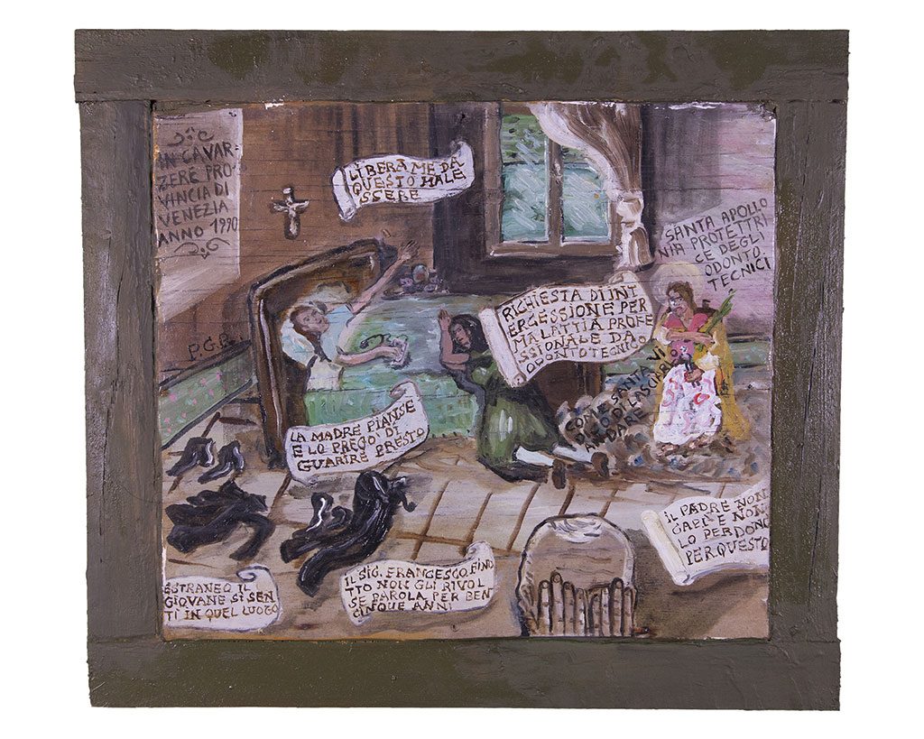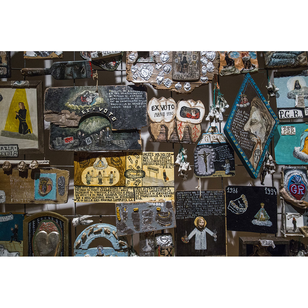 Le singole tavolette, secondo le parole dello stesso Maurizio Finotto realizzate in maniera “mistica e ossessiva”, in gran parte con frammenti di legno recuperati dal mare e lavorate con materiali poveri in diverse tecniche, riprendono iconografie e modalità testuali tipiche delle tradizioni popolari della fede cristiana, disvelando eventi drammatici o imbarazzanti che hanno fortemente condizionato l’esistenza dell’autore. Allestite con la densità espositiva tipica delle usanze tradizionali nei luoghi di culto, le opere narrano per immagini l’infanzia dell’artista, l’abbandono del paese natale nella provincia veneta e di un lavoro sicuro per intraprendere gli studi artistici a Bologna, le alterne fortune di una carriera tortuosa, gli incidenti, gli insuccessi e i traguardi raggiunti nella professione e nella vita privata.
