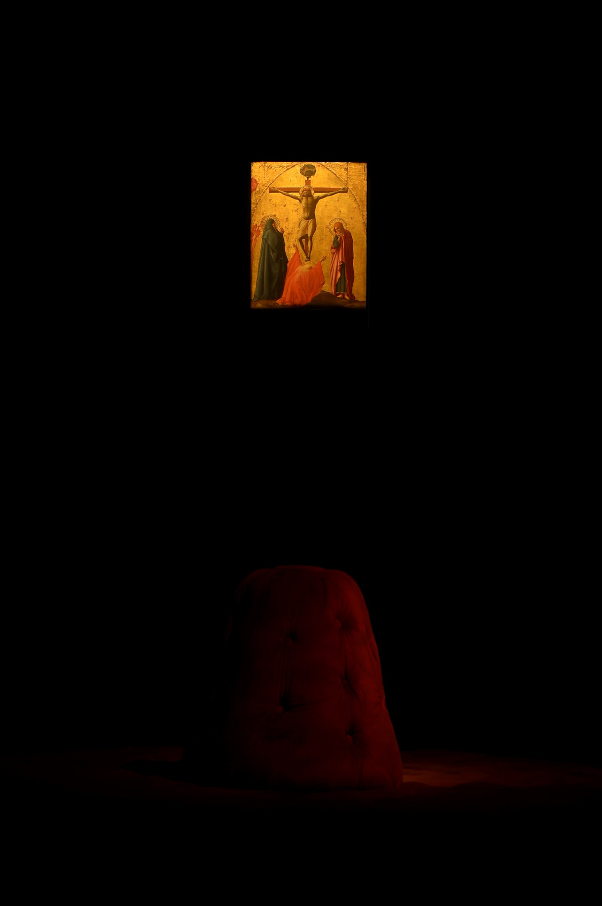 Una sola è l’opera voluta da Riccardo Muti: la Crocifissione di Masaccio. Da tempo, la piccola tavola, tra tutte le meravigliose opere del Museo, aveva folgorato il Maestro a tal punto da spingerlo a ricercare i motivi di questa ‘attrazione’ nella tormentata storia del quadro e nell’osservazione assidua dell’opera, con gli occhi di chi non è esperto d’arte ma nutre una profonda passione verso tutte le forme dell’arte. Ed ecco che Muti ci restituisce un’appassionata interpretazione della Maddalena: “La figura che sgomenta di più è questa irruzione della Maddalena. Sembra veramente che nella staticità della Madonna e di Giovanni e del corpo ormai crollato di Cristo questa figura entri furiosamente, imperiosamente nel quadro. Sembra appartenere ad un mondo completamente diverso, al mondo dell’amore, al mondo della passione, anche in un certo modo della passione fisica perché innanzitutto i colori che Masaccio affida alla Maddalena sono in fortissimo contrasto con le altre due figure e con Cristo stesso ovviamente. La Maddalena ha un mantello rosso fuoco ed è insolitamente biondissima con capelli sciolti e sembra provenire proprio dal mondo della passione, verso Cristo, verso il Dio, verso l’uomo. E con le braccia completamente aperte come per voler abbracciare il Cristo morente”.