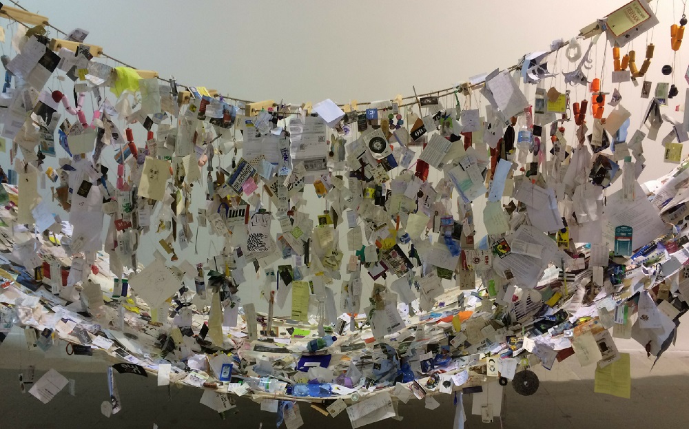 In the Auditorium Anteroom, a rainbow of coloured threads and needles dangles over an expansive white cloth. Audiences are similarly encouraged to sew their names, poems, images, or small keepsakes representing personal memories or impulses onto the cloth.